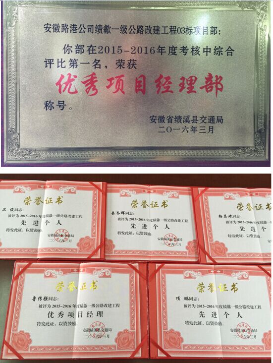 近日,我公司承建的S215績溪至歙縣一級路改建工程03標,在績溪縣交通局2015年度在建工程綜合考評中,排名第一。榮獲“優(yōu)秀項目經(jīng)理部”、“優(yōu)秀項目經(jīng)理”、“先進個人”等榮譽稱號。