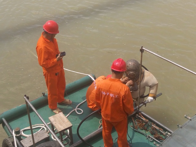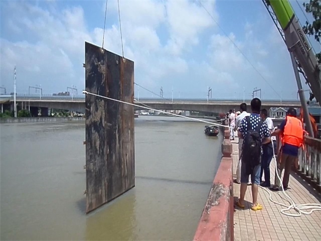 經過十幾個小時的連夜緊張奮戰,7月8日中午,蕪申運河城區段02標境內青弋江市區段鐵橋老泵站自流涵臨江側被一塊重達8噸的鋼板加固,徹底消除度汛安全隱患。老泵站淘汰時自流涵廢棄但未拆除,主汛前項目部已組織進行應急加固,但在長時間高水位浸泡的情況下,仍存在較大的度汛隱患。根據市委主要領導的要求,7月7日晚,項目部立即從合肥市調運厚約2厘米鋼板4塊,連夜在現場加工成一塊長8米、寬6米、重達8噸的長方形鋼板,利用吊機吊至自流涵進口,并派潛水員對封堵情況進行檢查,保證鋼板封堵在自流涵進口,確保該處防洪萬無一失。