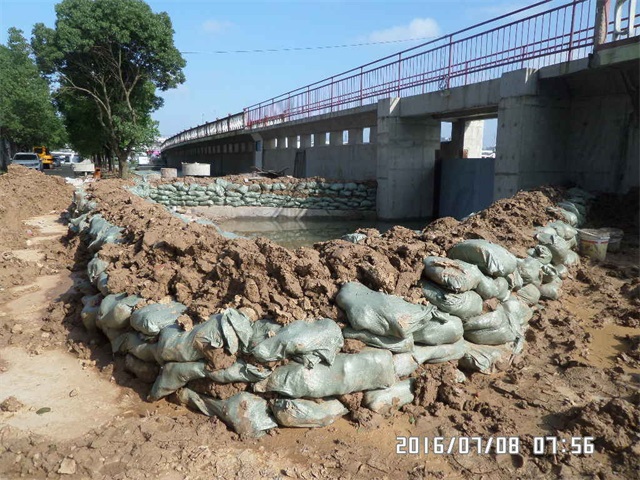蕪湖市機電排澇站處通江閘改造原不屬于我部項目清單范圍內施工任務,為新增施工項目,我部已于2015年10月全部完成通江閘改造及原有閘門安裝工程。但弋江區防汛指揮部在2016年7月5日下午巡查時發現通江閘閘門處由于原有閘門橡膠墊老化,導致部分滲水,隨即緊急召集項目部等相關單位研討處理方案。之后,蕪申運河02標項目部立即展開應急行動,從銅陵路高架項目部、巢湖閘錨地工程項目部調轉人員和機械設備連夜搶工,于7月6日早完成了對墻內的圍堰設置,以確保城區汛期安全。