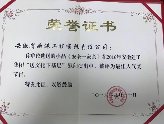 此次集團公司慰問巡演得到了公司領導的高度重視和大力支持,公司由工會牽頭,團委配合,抽調公司機關和項目部的文藝骨干參與演出,從題材的選擇、劇本的創作、節目的編排以及演出服裝、道具等,演職人員付出了辛勤的汗水。俗話說“臺上十分鐘,臺下十年功”。演員們不怕辛苦,認真堅持排練,節目在一遍一遍的學習和練習中漸漸成型。訓練和演出中,演員們揮汗如雨,只為能把最好的節目奉獻給觀眾。付出是值得的,節目受到了集團公司領導和各單位職工的贊賞。最終,公司喜獲優秀組織獎,選送的小品《安全一家親》獲得了最佳人氣獎節目的好成績,為公司爭得了榮譽,為大家展示出了安徽路港人良好的精神風貌。