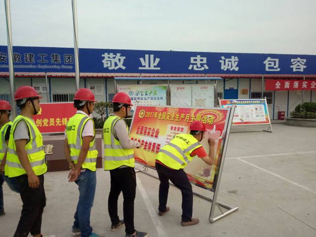我是一名安徽建工人,我鄭重宣誓:時刻注意安全,遵守安全法規。履行安全職責,提高安全技能。杜絕三違現象,保證四不傷害。強化紅線意識,促進安全發展。為了家人幸福、企業發展,誓做建工“安全人”。錚錚誓言響徹云霄,筆尖揮斥千金承諾。6月1日至2日,安徽路港公司機關及所屬各單位、項目部莊嚴舉行了2017年“安全生產月”宣誓簽名儀式,拉開了今年以“全面落實企業安全生產主體責任”為主題的“安全生產月”系列活動序幕。