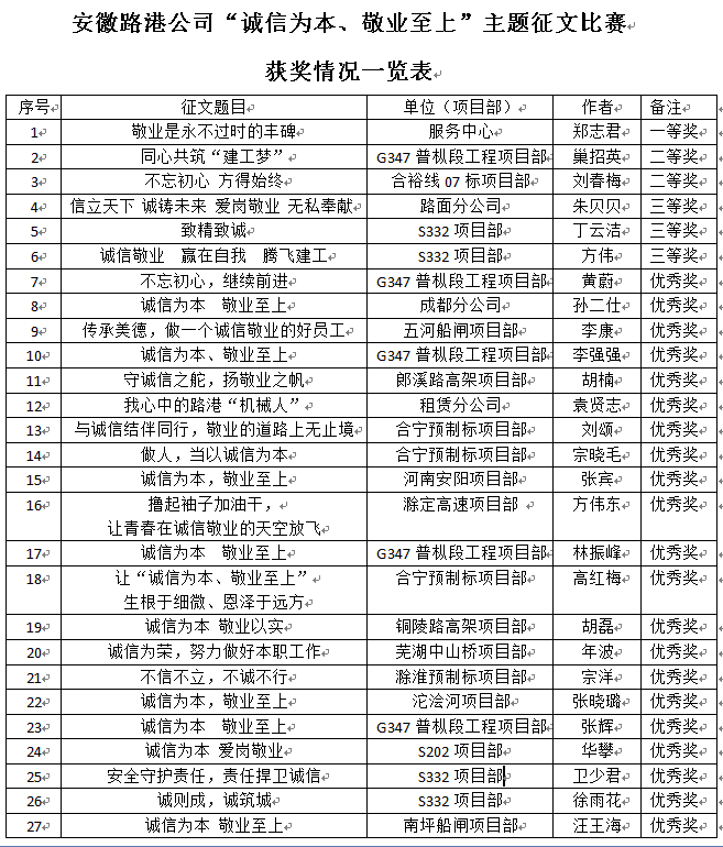 此前開展的主題征文比賽自 5月底正式啟動以來,各基層黨支部廣泛動員、積極參與,受到了廣大一線員工的熱烈響應和歡迎。活動中,參賽選手結合公司改革發展實際,暢談對“誠信、敬業”的體會,用所見所聞、所思所想,通過樸實、生動的文筆,記錄和講述了踐行集團核心價值觀的典型故事,弘揚了正能量。本次征文活動共收到征文27篇,通過認真評審,鄭志君榮獲征文比賽一等獎,巢招英、劉春梅獲得二等獎,朱貝貝、丁云潔、方偉獲得三等獎。