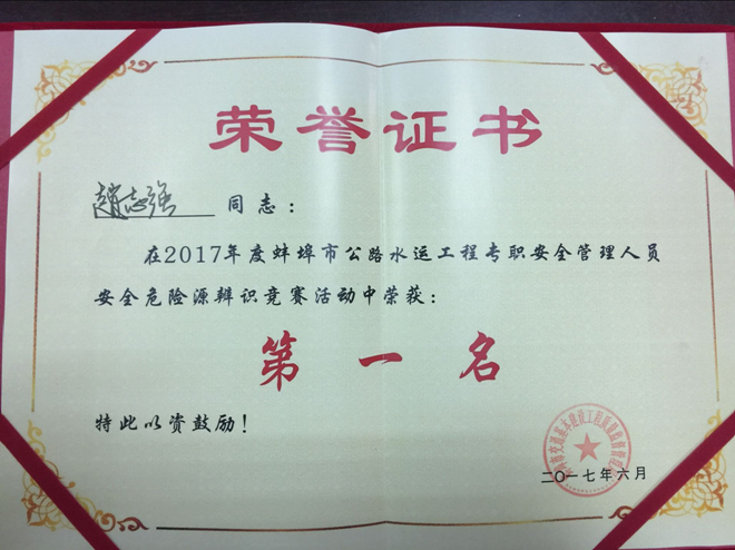 6月29日,在2017年度蚌埠市公路水運(yùn)工程專職安全管理人員安全危險(xiǎn)源辨識競賽中,安徽路港五河船閘趙志強(qiáng)同志憑借現(xiàn)場出色表現(xiàn),榮獲第一名。