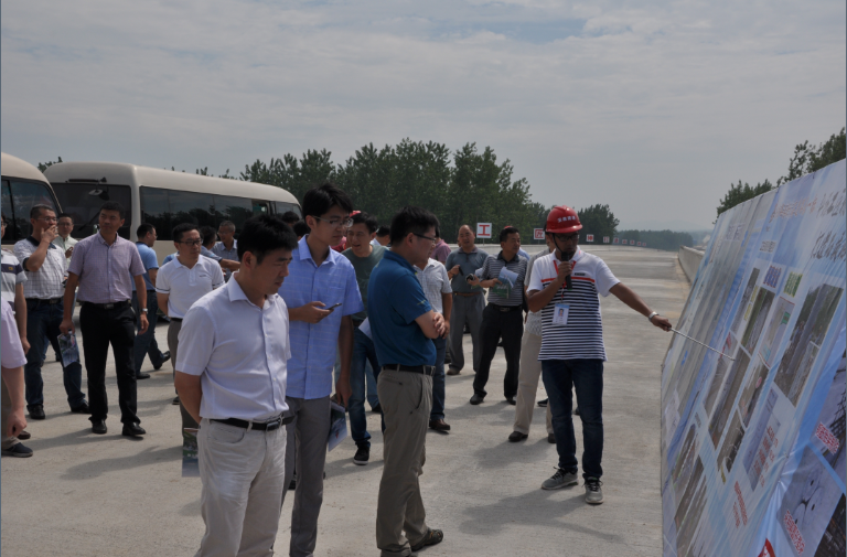 項目總工向觀摩團簡要介紹了工程概況、施工組織、橋梁工程施工精細化控制措施等。聽完介紹后,觀摩團隊伍駐足觀看了宣傳展板,紛紛舉起相機、手機紀錄項目建設的先進做法,并對滁定01標路基橋梁質量可控、安全管理有保障、新技術、新工藝、新材料應用,安全質量管理程序化、施工現場安全防護標準給予高度評價。