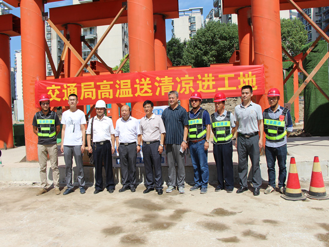 7月19日上午,蕪湖市交通運輸局黨委委員、總工程師沈朝榴在港航管理局副局長詹應線、項目辦主任牧啟標等同志陪同下,蒞臨安徽路港蕪湖市中山橋改建工程項目進行“高溫送清涼下工地”慰問活動,為冒高溫、戰酷暑的一線建設者們發放了仁丹、清涼油、十滴水、毛巾、香皂及礦泉水等防暑降溫用品,并向全體建設者致以親切慰問。