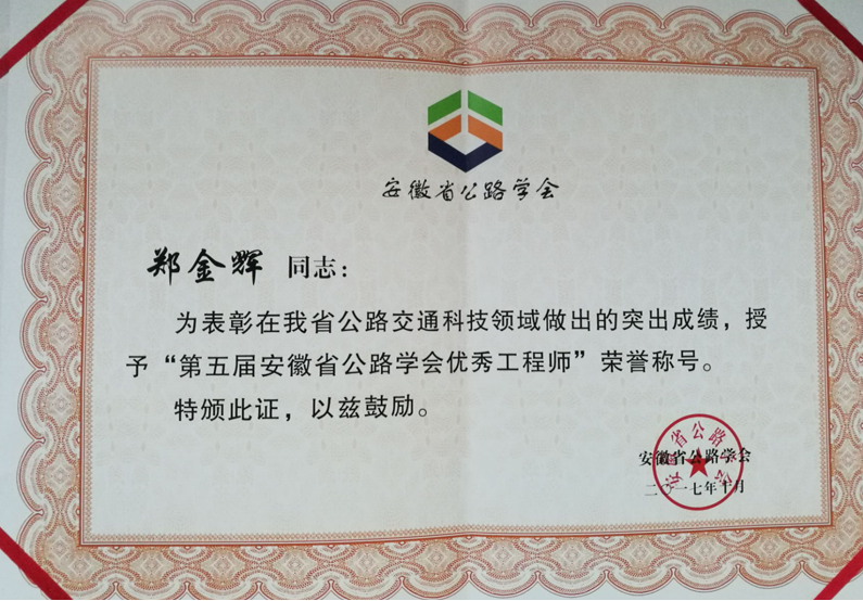“安徽省公路學(xué)會優(yōu)秀工程師”是我省公路交通行業(yè)科技領(lǐng)域的學(xué)術(shù)和技術(shù)帶頭人,是全省公路交通行業(yè)優(yōu)秀工程技術(shù)人員的代表。