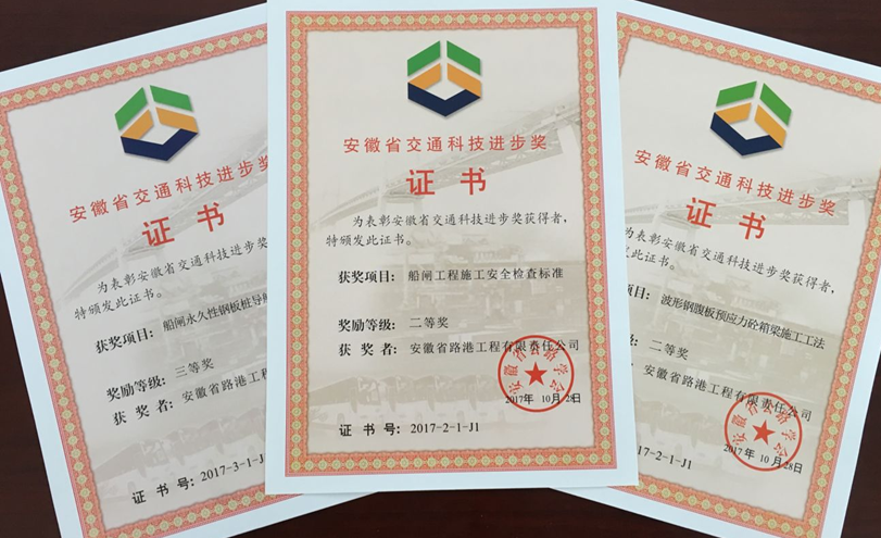 以上獎項(xiàng)的獲得是安徽路港公司發(fā)展的信心和動力, 我們將珍惜榮譽(yù),發(fā)揚(yáng)成績,再接再厲,為安徽公路交通事業(yè)做出更大貢獻(xiàn)。