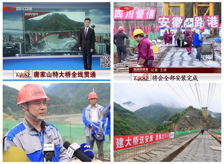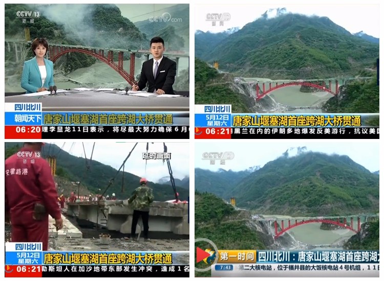 5月11日上午11點,隨著主橋最后一片π梁架設完成,由安徽路港承建的北川唐家山堰塞湖跨湖大橋順利貫通,“羌紅”飛躍堰塞湖。中央電視臺新聞頻道《朝聞天下》、財經頻道《第一時間》、四川衛視《新聞早班車》、綿陽市電視臺《直播綿陽》等欄目均在第一時間進行了報道。