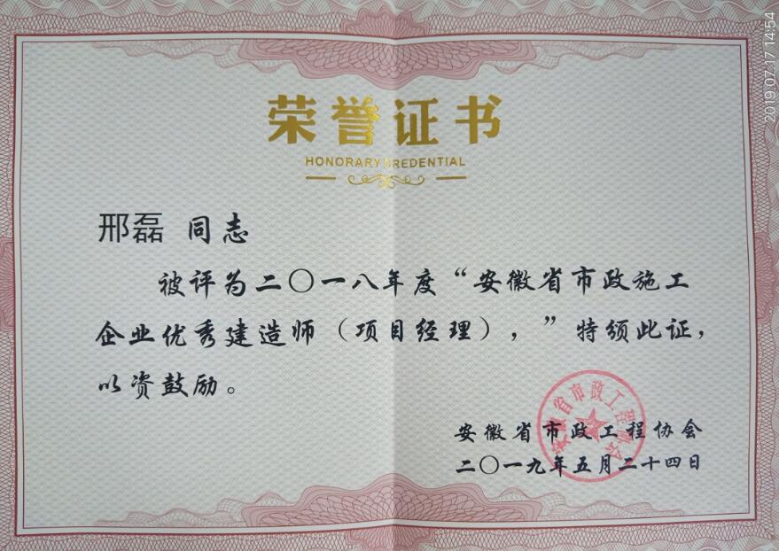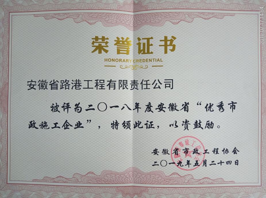 近日,從安徽省市政工程協會獲悉,安徽路港公司榮獲2018年度“安徽省優秀市政施工企業”榮譽稱號,公司職工邢磊被評為2018年度“安徽省市政施工企業優秀建造師(項目經理)”。