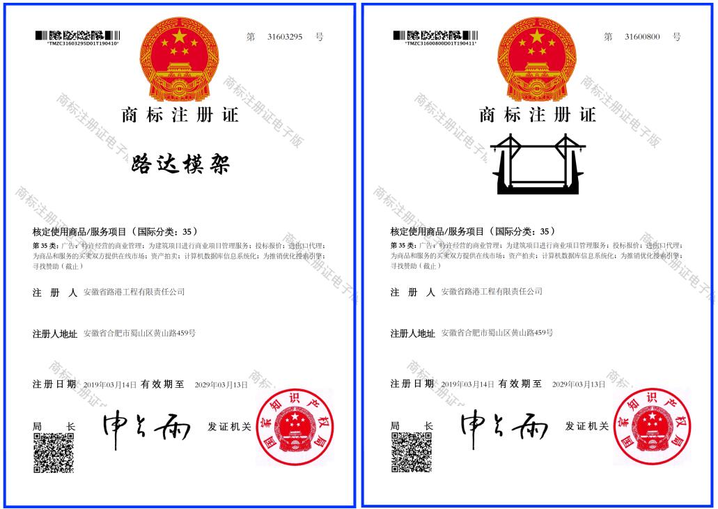 近日,安徽路港申請注冊的“路達模架”文字商標及圖形商標,獲得國家知識產權局核準注冊成功。