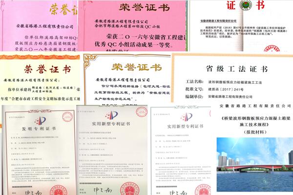 郎溪路高架項目是我公司進入合肥市政市場一個重要標志性項目,項目伊始,公司精心組織策劃,明確“確保廬州杯,爭創黃山杯”的創建目標,施工過程中嚴格質量安全管理,重視新技術研發應用推廣。目前該項目獲得發明專利1項,實用新型專利2項,省級工法1項,企業工法 2項,安徽省交通科技進步獎1項,安徽省建筑優秀QC成果一等獎2項,安徽省勘測設計鑒定成果1項,2017年度合肥市市政工程安全文明標準化示范工地、2019年度安徽省建筑安全生產標準化示范工地,安徽省環境保護AAA級環保施工示范工地,合肥市市政優質工程廬州杯獎,并主編安徽省地方標準(《橋梁波形鋼腹板預應力混凝土箱梁施工技術規程》)。接下來,繼續努力爭創省部級以上獎項。