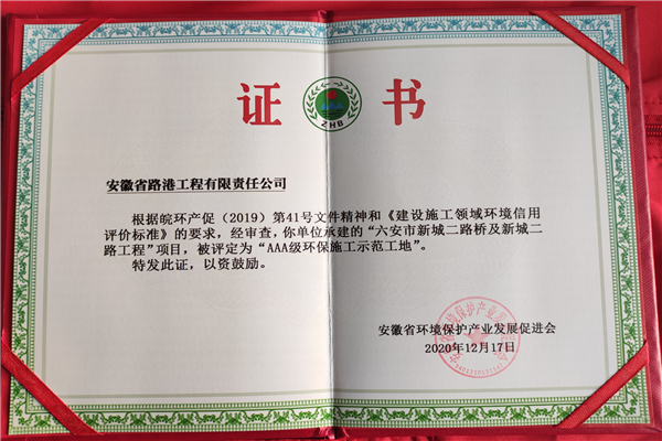 安徽省建設(shè)行業(yè)質(zhì)量與安全協(xié)會(huì)、安徽省環(huán)境保護(hù)產(chǎn)業(yè)發(fā)展促進(jìn)會(huì)授予第三分公司六安市新城二路橋項(xiàng)目“安全生產(chǎn)標(biāo)準(zhǔn)化工地”“AAA級(jí)環(huán)保施工示范工地”稱號(hào)。