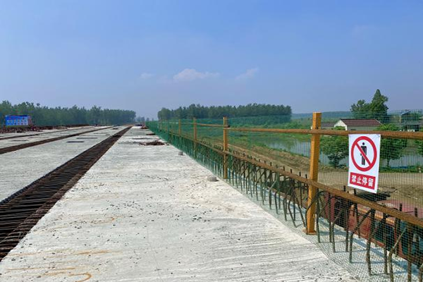 銅陵市G236青通河大橋項目部通過加強安全文化建設,進一步推動安全標準化施工。在橋梁施工方面,橋面施工入口采用剛性防護和制作大門進行封閉式施工,設置進入施工現場十不準、單元預警牌、安全入場告知牌、高溫天氣發布牌等標志標牌對施工人員進行安全警示。臨邊護欄采用雙層護欄圍護,上掛安全網與警示標牌,此類防護既能防止人員高處墜落,又能提升項目的安全管理形象。