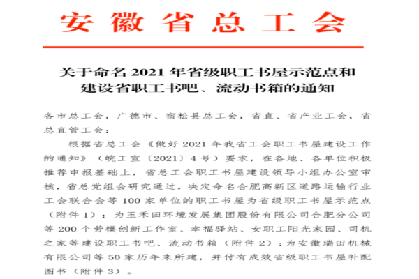 近日,安徽省總工會下發《關于命名2021年省級職工書屋示范點和建設省職工書吧、流動書箱的通知》,安徽路港公司職工書屋獲安徽省總工會“職工書吧”榮譽稱號。