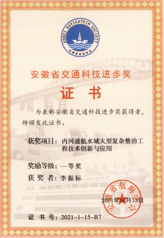 12月17日上午,安徽省航海學會六屆二次理事會在蕪湖順利召開。會上頒發了2021年度安徽省交通科技進步獎(水運部分),安徽路港公司作為第一完成單位的科技成果——《內河通航水域大型復雜整治工程技術創新與應用》喜獲一等獎。《澮河航道南坪船閘工程建造關鍵技術研究與應用》榮獲二等獎,《復雜水域地質條件碼頭下部結構施工控制關鍵技術研究》、《通航河道中可升降鋼便橋施工關鍵技術研究》及《高頻破碎錘破除水下礁石施工關鍵技術研究》榮獲三等獎。公司黨委委員、副總經理、總工程師蘇穎代表公司領取獲獎證書。