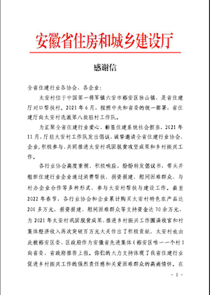 近日,省住房與城鄉建設廳向公司發來感謝信,對公司參與太安村幫扶與建設工作表示感謝。