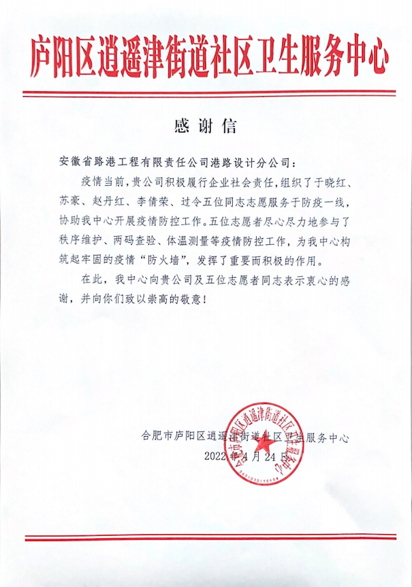 4月24日,勘測設計研究院收到合肥市廬陽區逍遙津街道社區衛生服務中心的感謝信,信中對于曉紅、蘇豪、趙丹紅、李倩榮、過令五位同志積極投身于社區疫情防控工作給予了高度肯定和衷心感謝。 感謝信中指出,疫情當前,勘設院志愿者們積極響應公司號召,踴躍投入防疫一線,始終與社區工作人員一起在秩序維護、體溫測量、兩碼查驗的主戰場上并肩作戰,構筑起基層疫情防控的嚴密防線,以實際行動踐行了“奉獻、友愛、互助、進步”的志愿者精神,共同為打贏疫情防控阻擊戰作出了積極貢獻。