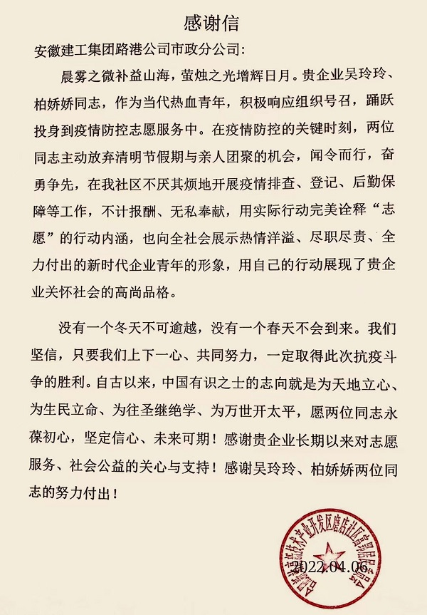 這些感謝信是對志愿者們的認可,共同見證了安徽路港建設者逆行的最美身影,見證了國企的使命擔當。越是艱難越向前,公司將持續服務疫情防控大局,躬身入局,為地方防疫貢獻力量!
