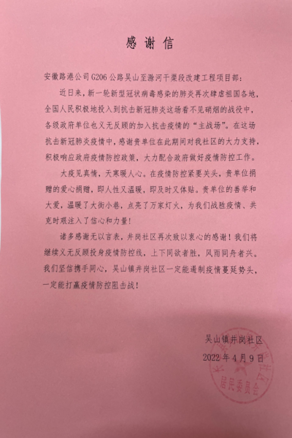 4月9日,吳山鎮井崗社區發來感謝信,對G206項目積極配合參與抗擊新冠疫情工作及提供防疫物資表示感謝。此次G206項目職工自發為吳山鎮井崗社區捐贈物資,極大地保障了防控疫情工作的順利開展,也讓職工切實體現和踐行了“雷鋒精神”,為防控疫情工作順利開展貢獻“正能量”。