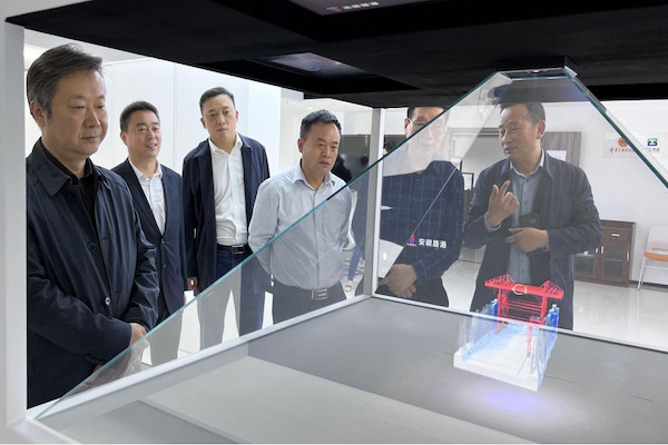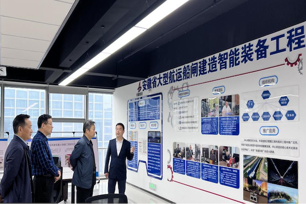 交流會前,各級領導集中參觀了蘇穎勞模創新工作室與省船閘建造智能裝備工程研究中心,觀摩了新一代“造閘機”系列產品實體模型和3D全息投影展示,深入了解該設備科技創新水平與應用效益。