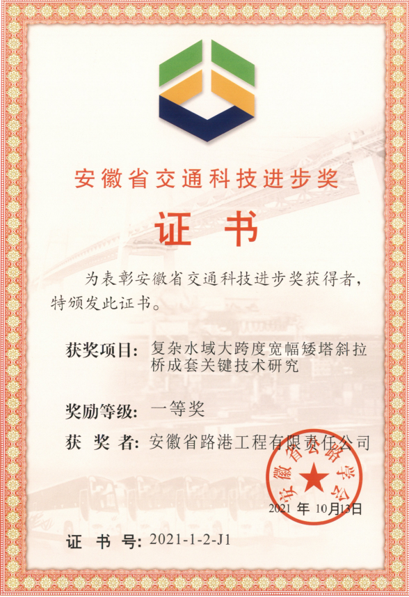安徽路港公司喜獲2021年度安徽省交通科技進步獎一等獎