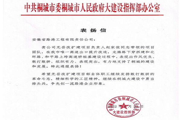 勞動競賽期間,項目部先后收到安徽交控集團無桐項目辦、中共桐城市委市政府大建設(shè)指揮部、桐城市人民政府發(fā)來三封表揚信,極大鼓舞了全體職工的工作積極性,項目部發(fā)揚“特別能吃苦,特別能戰(zhàn)斗”的企業(yè)作風(fēng),確保施工進度,保證工程質(zhì)量,落實安全文明施工,展現(xiàn)了國企的風(fēng)采與擔(dān)當(dāng)。