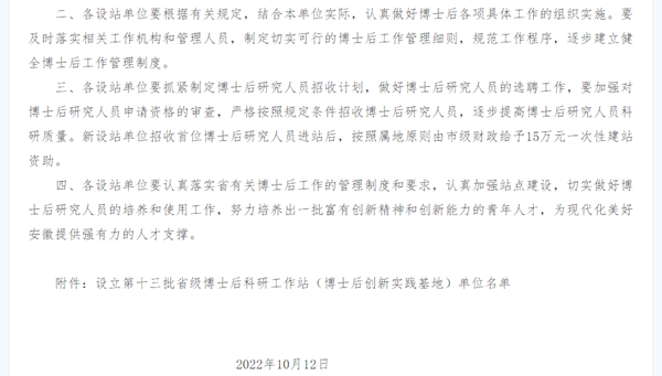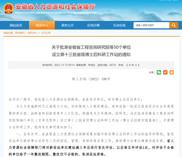 10月19日,安徽省人力資源和社會(huì)保障廳發(fā)布了《關(guān)于批準(zhǔn)安徽省工程咨詢研究院等50個(gè)單位設(shè)立第十三批省級(jí)博士后科研工作站的通知》(皖人社秘〔2022〕198號(hào)),安徽路港公司作為本批次唯一一家施工企業(yè)光榮上榜,獲批設(shè)立省級(jí)博士后科研工作站。