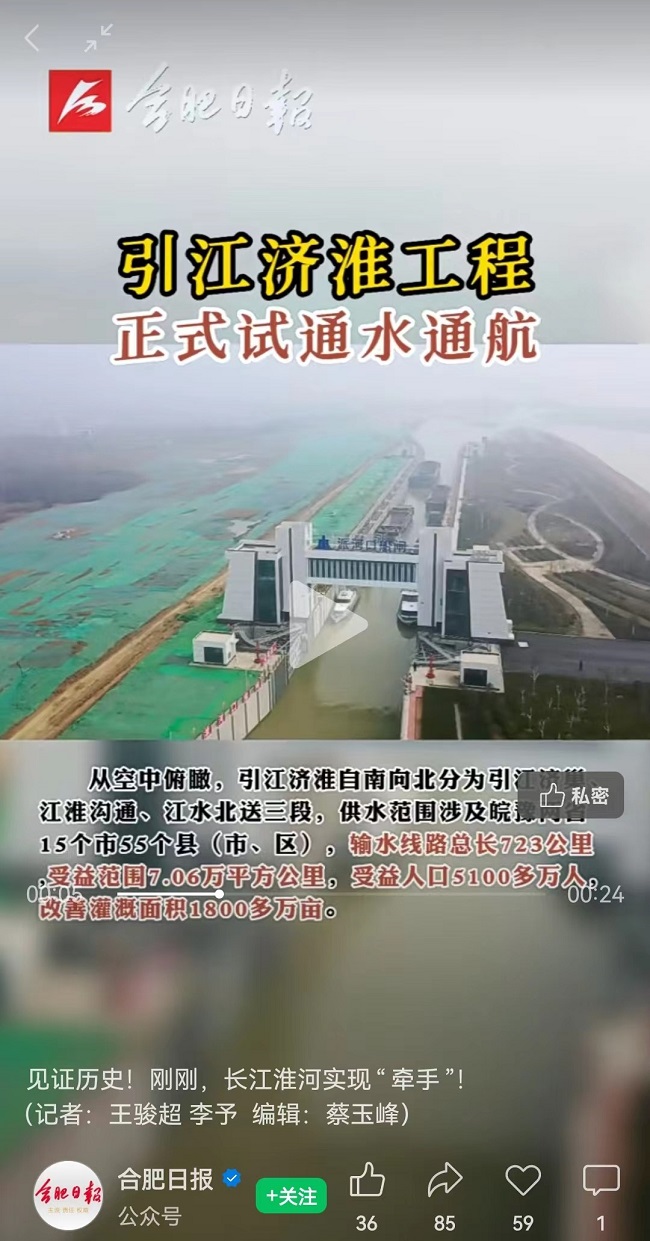 媒體報道丨人民網、安徽日報、合肥日報等主流媒體聚焦引江濟淮工程試通水通航