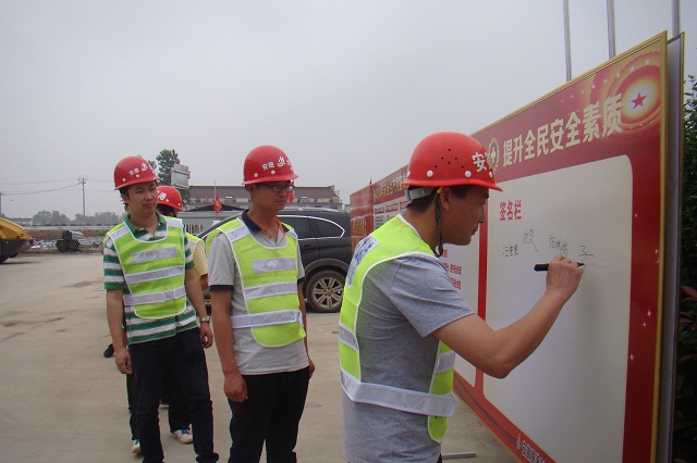 項目部負責人強調:大家要時刻牢記安全誓言,時時提醒參建員工注意安全,增強全員的安全意識,提高安全生產(chǎn)的自覺性和主動性,為項目部順利完工創(chuàng)造條件。最后,全體員工在安全簽名欄上簽名,紛紛表示將立足崗位,信守誓言,堅持原則,嚴把安全關、質量關。
