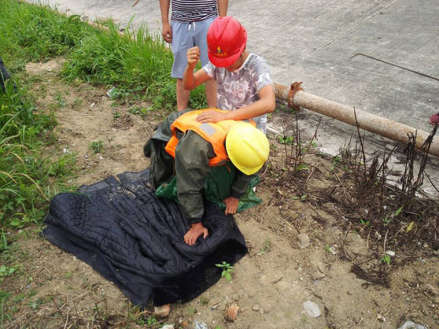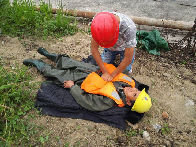 演練假設(shè)在合肥港上游2#靠船墩施工作業(yè)平臺(tái)處臨水面作業(yè),一名工人不慎失足跌落水中,工人身體狀況良好,落水時(shí)穿戴有救生衣。由于不會(huì)水性,在水中拼命掙扎嗆了好幾口水,體力不支,身體慢慢開(kāi)始下沉,現(xiàn)場(chǎng)救援人員迅速營(yíng)救落水者上岸,發(fā)現(xiàn)其已經(jīng)處于休克昏迷狀態(tài),應(yīng)急救援人員對(duì)落水者進(jìn)行人工呼吸和心肺復(fù)蘇后緊急送往醫(yī)院。
