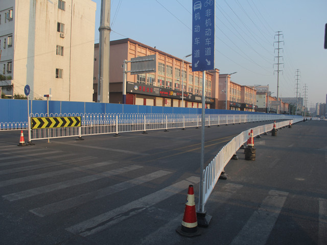 為保證交通暢通,減小對周邊居民出行的影響,現場采取半封閉式圍擋措施,用護欄進行分道。封道前,項目部領導班子帶領項目部全體技術人員及現場施工班組研究制定了交通封閉方案,將工作具體分解到每個人。由于封道期間正值周五晚上,銅陵北路上車流量極大,給項目部工作帶來一定難度,項目部本著先交通導改后圍擋實施的原則,將整條路段分為8個施工區域,由9個施工班組的200余名工人同步實施,項目部領導班子和全體技術人員共計40余人在現場組織協調、指揮調度,確保了封道和護欄圍擋安裝工作正常、有序、安全開展。
