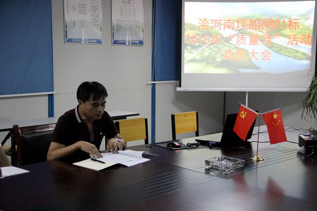會上,項目總工王佳勝對 “質量月”活動進行了詳細安排部署,要求項目各部門、各施工班組立即行動起來,全體動員,全員參與,深入開展2016年全國“質量月”活動,一定要嚴格按照活動安排部署方案要求,牢固樹立質量管理意識,自覺遵守質量管理規章制度,進一步推進南坪船閘項目部施工質量管理工作,確保工程質量達標,爭創精品工程。
