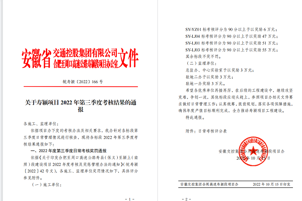 壽潁高速03標項目在疫情特殊時期,牢牢把握“疫情要防住、生產要穩住、安全要把住”的安全生產理念,在做好防疫工作的同時,通過自我加壓,緊密部署產值目標、施工計劃、施工組織等重點工作,積極調動廣大職工的責任感、緊迫感,有效發揮了勞動競賽“學、比、拼、超”積極作用,在安徽交控集團合周高速壽潁段項目辦開展的2022年第三季度考核結果中,得分優異,獲得了業主給予的55萬元的獎勵。