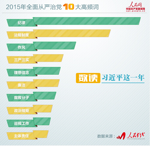 今年以來,細(xì)數(shù)習(xí)近平總書記的歷次重要講話,“紀(jì)律”“法規(guī)制度”“作風(fēng)”“三嚴(yán)三實(shí)”“理想信念”“廉潔”“腐敗分子/反腐敗”“政治規(guī)矩”“巡視工作”“主體責(zé)任”等成為了習(xí)近平總書記談全面從嚴(yán)治黨的10大高頻詞匯。從這些高頻詞中,我們或許能一窺習(xí)近平總書記對(duì)于全面從嚴(yán)治黨的總體戰(zhàn)略布局。