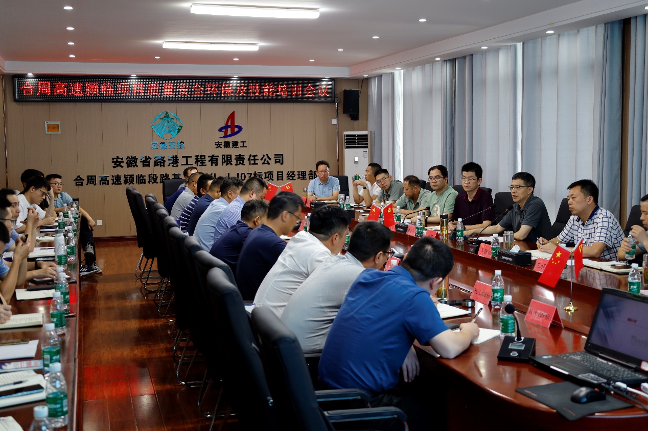 近日,安徽交控集團合周高速項目公司董事長章征一行到路橋分公司合周高速潁臨段路基07標組織召開質量安全環保及技能培訓會議,合周高速潁臨段項目辦、監理及其他兄弟標段負責人參加。