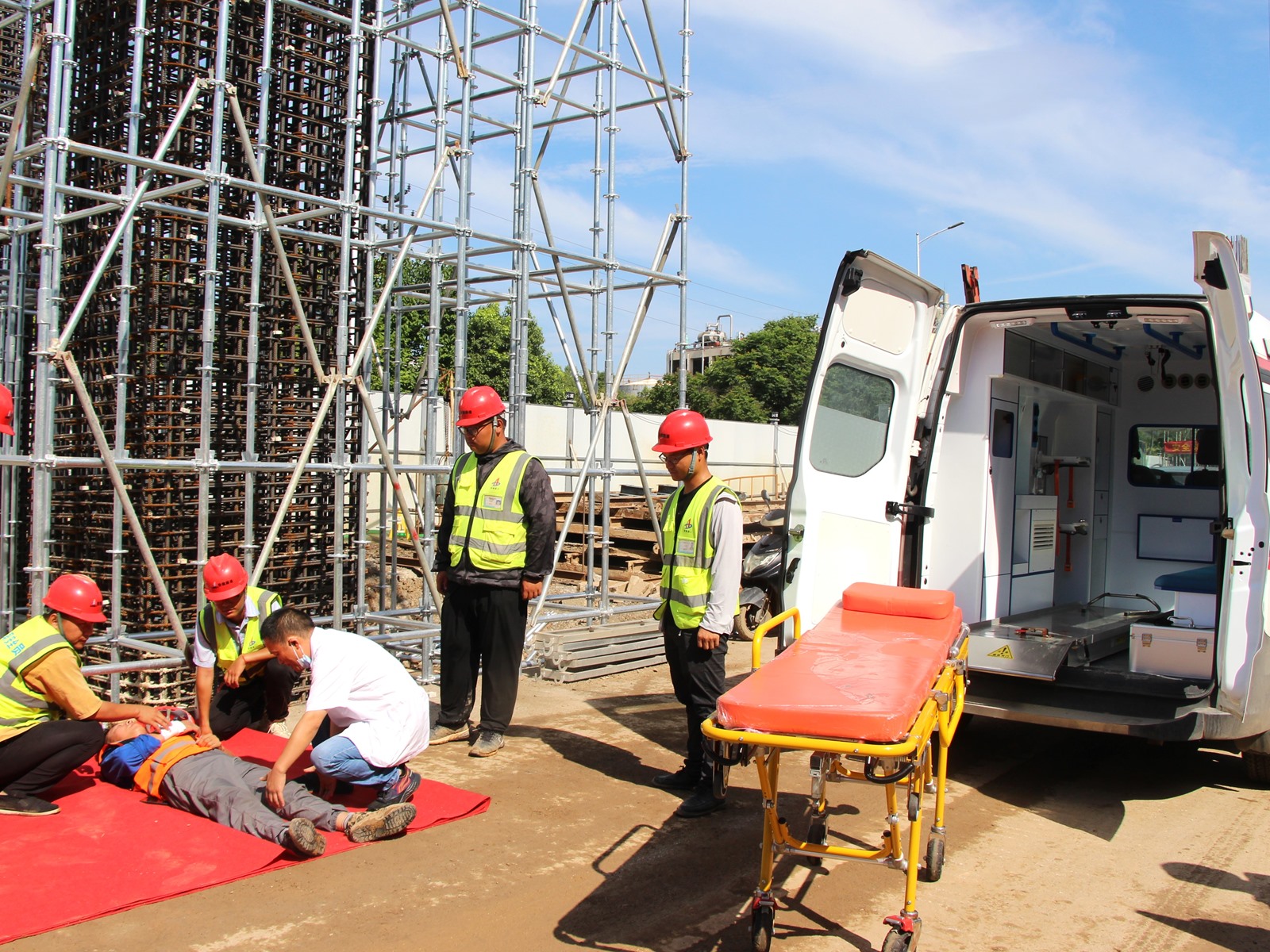 上午9點,演練正式開始,本次應急演練以高架橋墩柱模板施工作業時,1名作業人員由高處墜落為背景,事故發生后,項目部按照既定方案啟動應急響應,各應急小組迅速到位,進行事故現場緊急封閉,組織疏散圍觀群眾,配合醫護人員搶救傷員等應急措施。過程中各小組各司其職、緊密配合,順利完成各項任務,演練取得圓滿成功。
