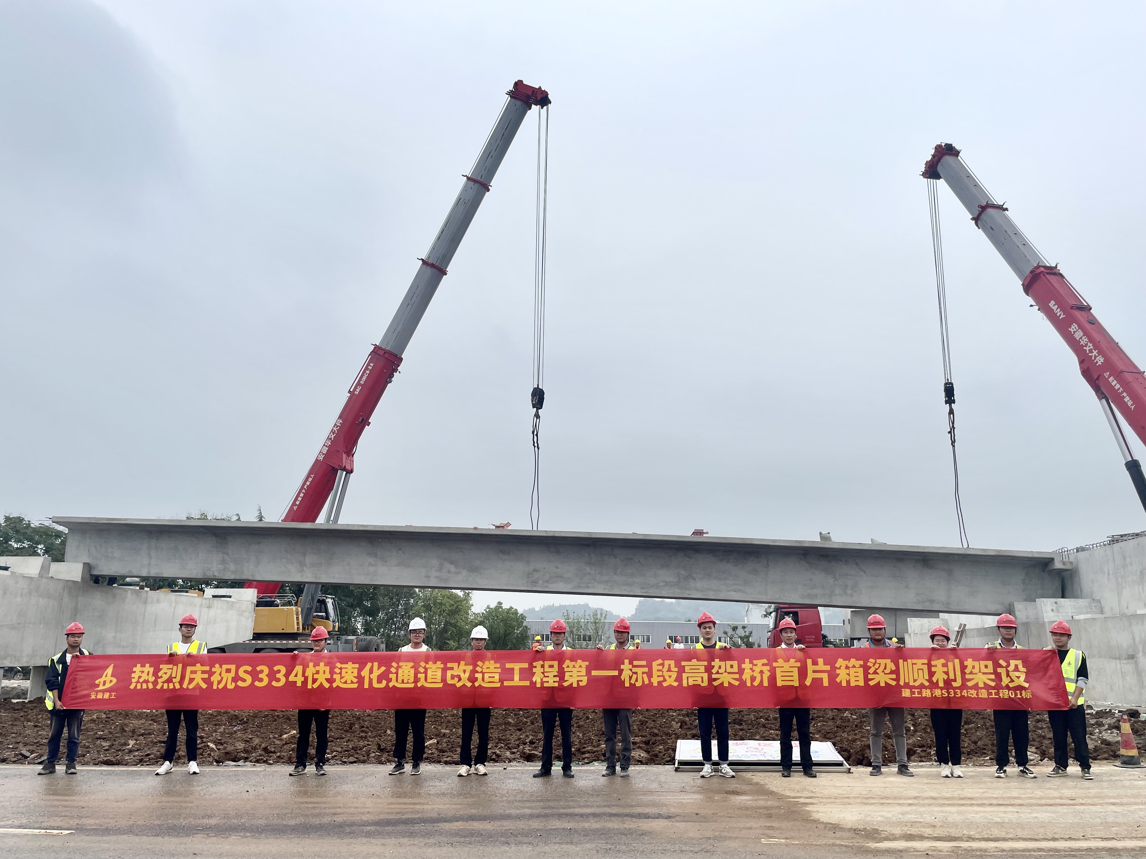 9月26日,S334(長江南路至繁陽大道段)快速化通道改造工程第一標(biāo)段K4+009高架橋首片預(yù)制箱梁架設(shè)成功。
