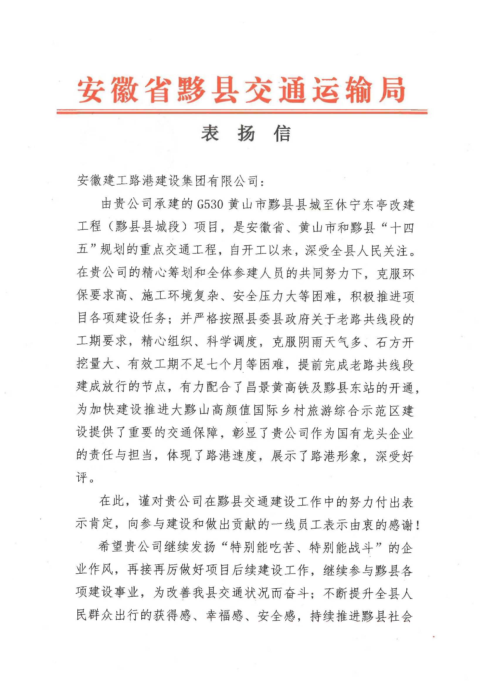 近日,G530黃山市黟縣縣城至休寧東亭改建項(xiàng)目收到黟縣交通運(yùn)輸局的表揚(yáng)信。