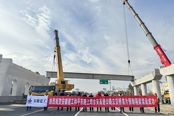 12月26日上午,一分公司桐城大建設和平東路上跨橋項目架梁現場,隨著兩臺吊車穩穩地將一片長30m、重100t的預制小箱梁安放第五跨上,標志著和平東路上跨合安高速公路立交橋工程首片箱梁架設成功。