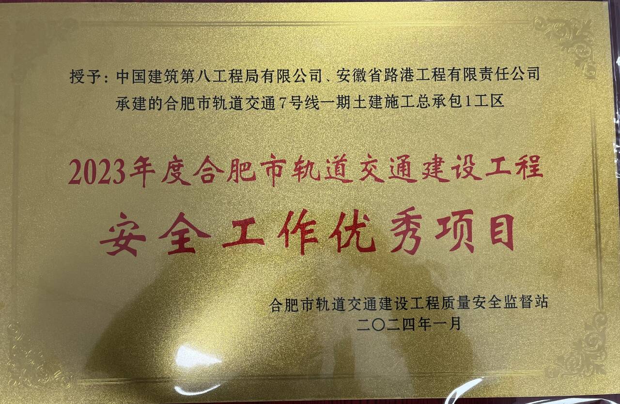 近日,由安徽建工路港建設集團有限公司承建的合肥市軌道交通7號線一期土建施工總承包項目榮獲2023年度合肥市軌道交通建設工程安全工作優秀項目稱號,對企業予以表揚并記優良行為記錄,同時項目經理獲得安全工作先進個人稱號。
