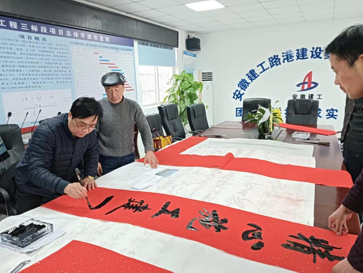 1月20日下午,明光市交通運輸局攜市書法協會赴建工路港路橋分公司G104明光段一級公路改建工程三標段項目舉辦“迎新春、繪春聯”活動。