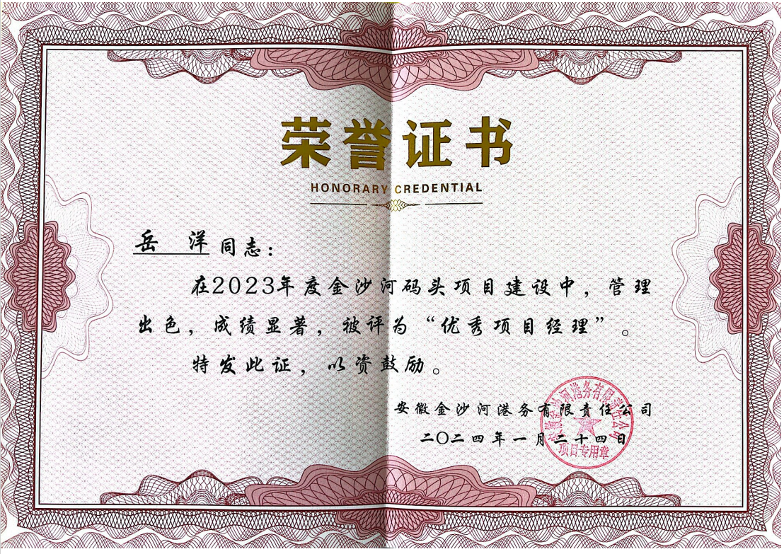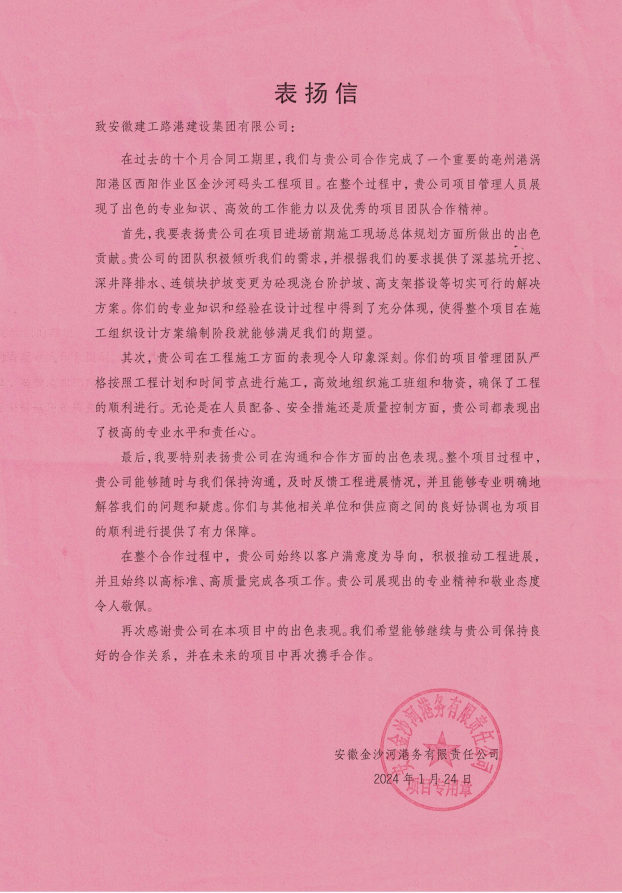 1月24日,亳州港渦陽港區西陽作業區金沙河碼頭項目收到安徽金沙河港務有限責任公司送來的表揚信和榮譽證書。