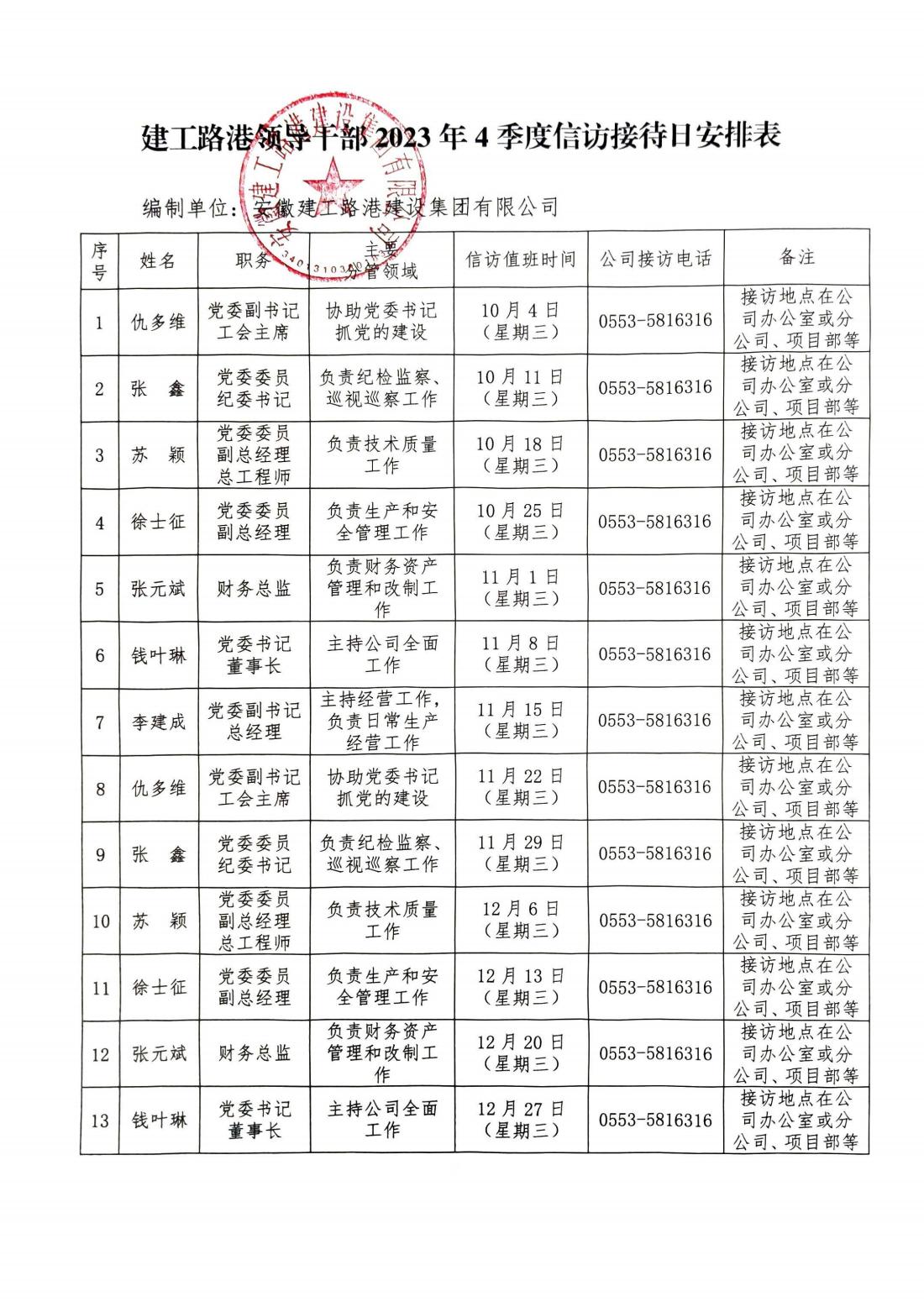 建工路港領導干部2023年4季度信訪接待日安排表