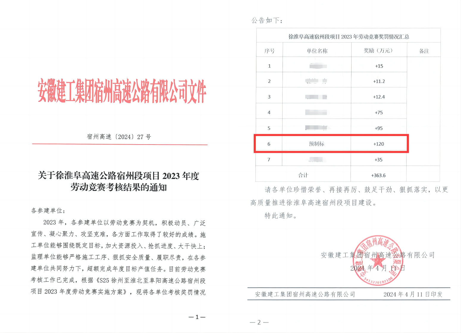 近日,安徽建工集團宿州段高速公路有限公司發來《關于徐淮阜高速公路宿州段項目2023年度勞動競賽考核結果的通知》,建工路港承建的宿州段預制標項目榮獲勞動競賽第一名并獲得獎勵。
