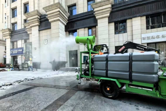 三是配備多名專職保潔人員,保證垃圾及時清理、場地及時清洗;多臺霧炮設備循環工作,保持作業過程濕潤無浮塵;物料集中擺放整齊,裸露土堆覆蓋濾網,保持現場布局有序、和諧美觀。