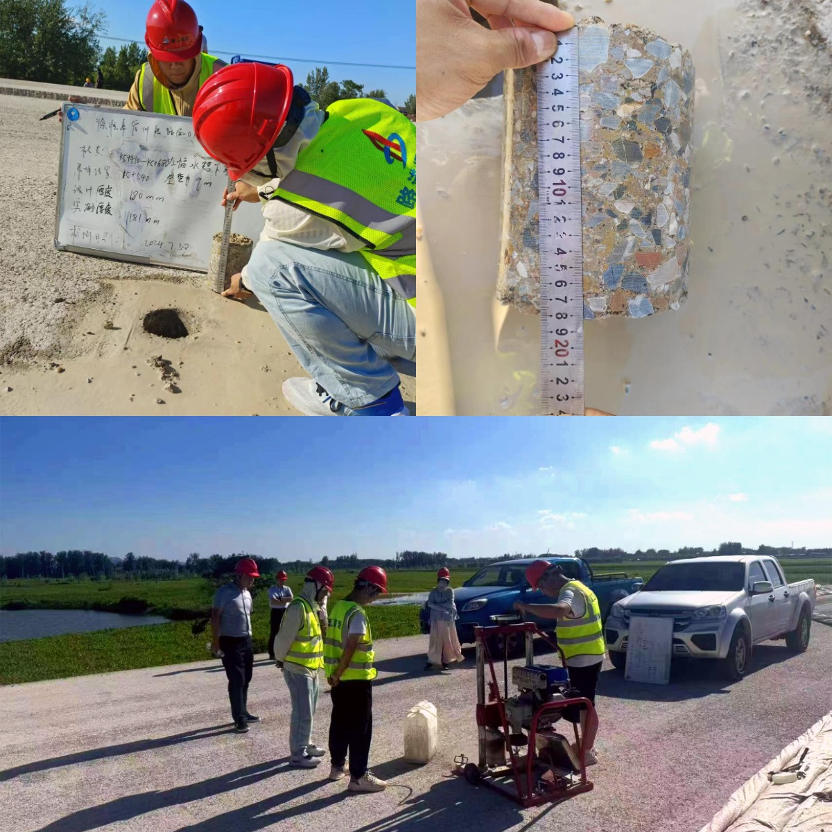 隨后,檢查組深入施工現(xiàn)場,對路面水穩(wěn)結(jié)構(gòu)層進(jìn)行取芯檢驗(yàn)厚度、抗壓強(qiáng)度、完整性、密實(shí)性,同時對砂石原材料進(jìn)行抽樣檢測。