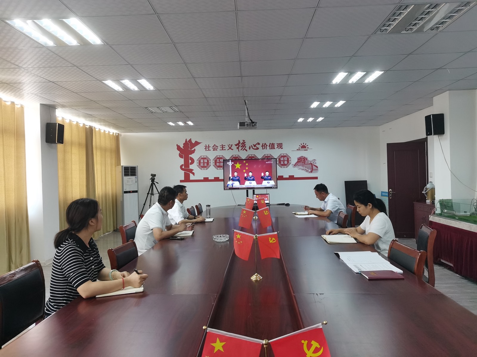 8月13日,來安安水組織全體職工觀看神舟十七號載人飛船成功發射相關視頻及三名航天員與中外媒體記者集體見面視頻。