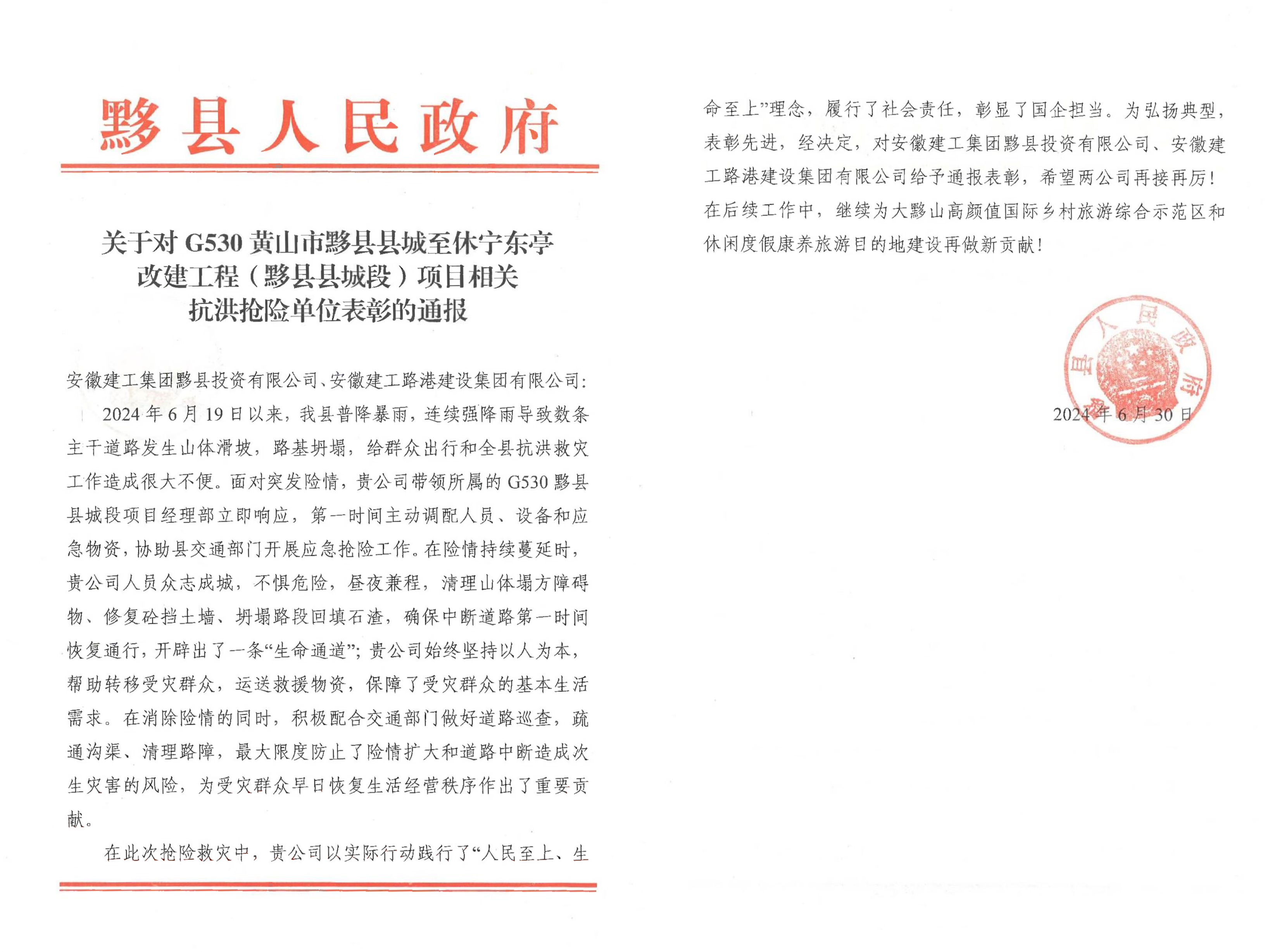 近日,一分公司黟縣G530項目收到黟縣人民政府的表彰通報。