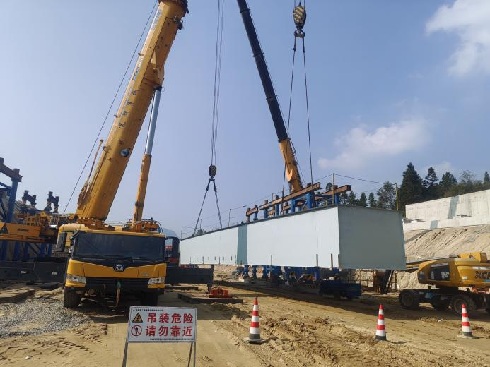 11月23日,建工路港涇青高速三分部AK0+723匝道橋首段箱梁隨著兩臺吊車緩緩升起,于高空之中平穩地進行縱移和橫移操作,最終緩緩落于指定位置,首片鋼箱梁順利完成吊裝。