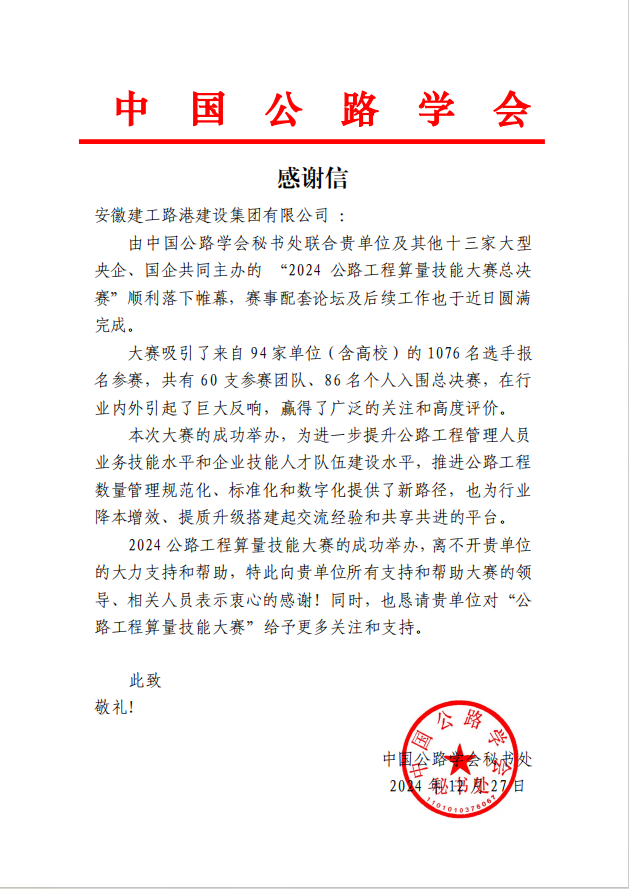 近日,中國公路學會向公司發來感謝信,感謝公司在“2024公路工程算量技能大賽總決賽”活動中所做出的積極貢獻。在此次全國算量大賽活動中,公司積極籌備,開展預賽選拔及過程培訓,最終參賽學員取得了優異的成績。